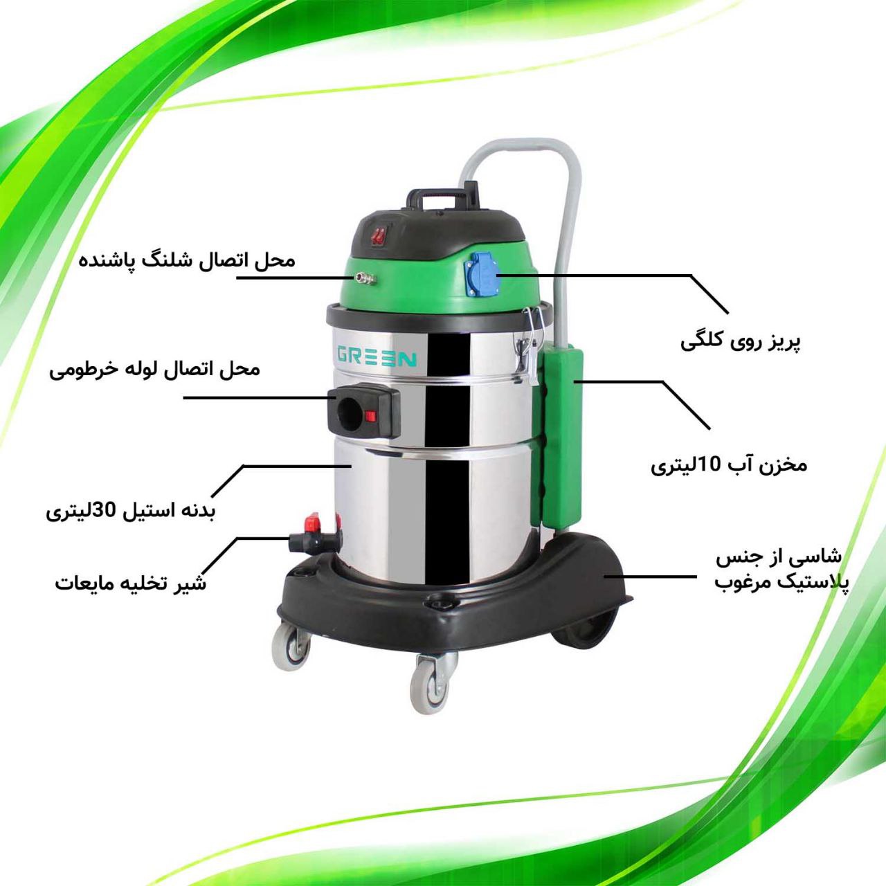 - ظرفیت مخزن مکنده: ۳۰ لیتر (۱۰ لیتر مفید)